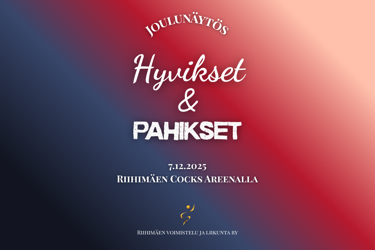 Riihimäen Voimistelu ja Liikunta RiVoLi ry:n Joulunäytös järjestetään 7.12.2025 Riihimäen Cocks Areenalla (Hj. Elomaan katu 4, 11130 Riihimäki) klo 10.00.